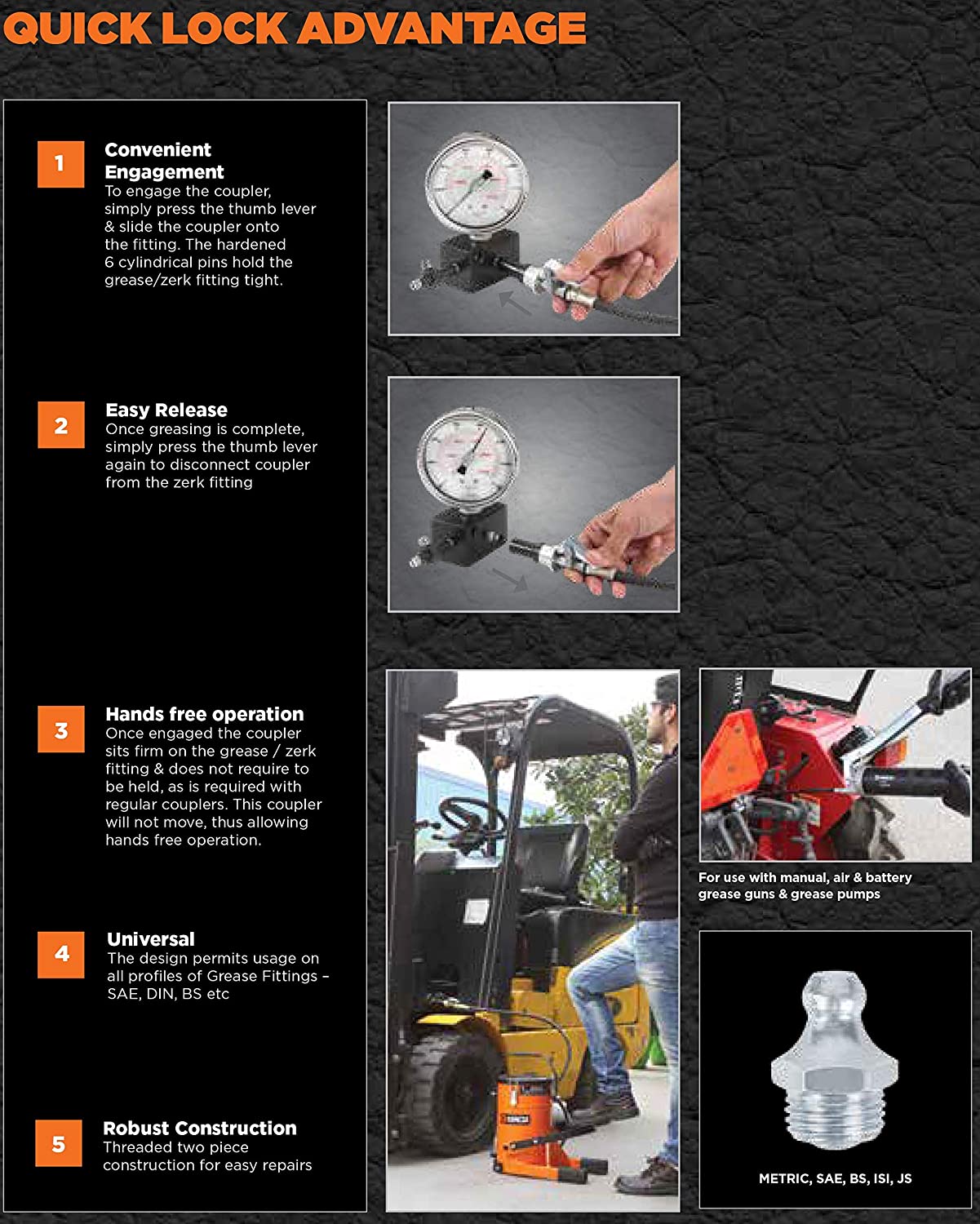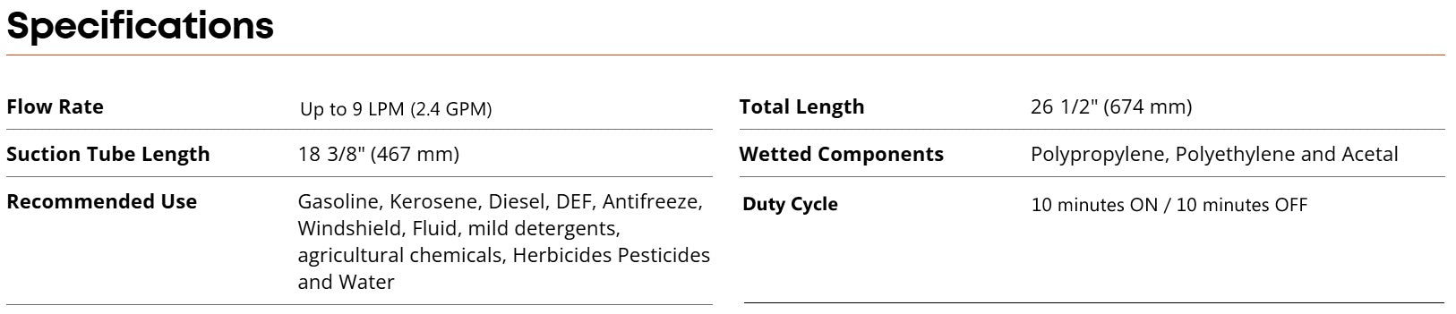 The approximate working life with one set of batteries is 264 gallons (1000 liter) with a duty cycle of 10 min ON/OFF. This pump comes with a 1 meter (3.3 feet) long flexible corrugated hose, nozzle holder, 18 3/8” (467 mm) long suction tube and a nozzle that comes with a convenient to operate trigger for full control on fluid out flow and no spillage even when the electric switch is ON.