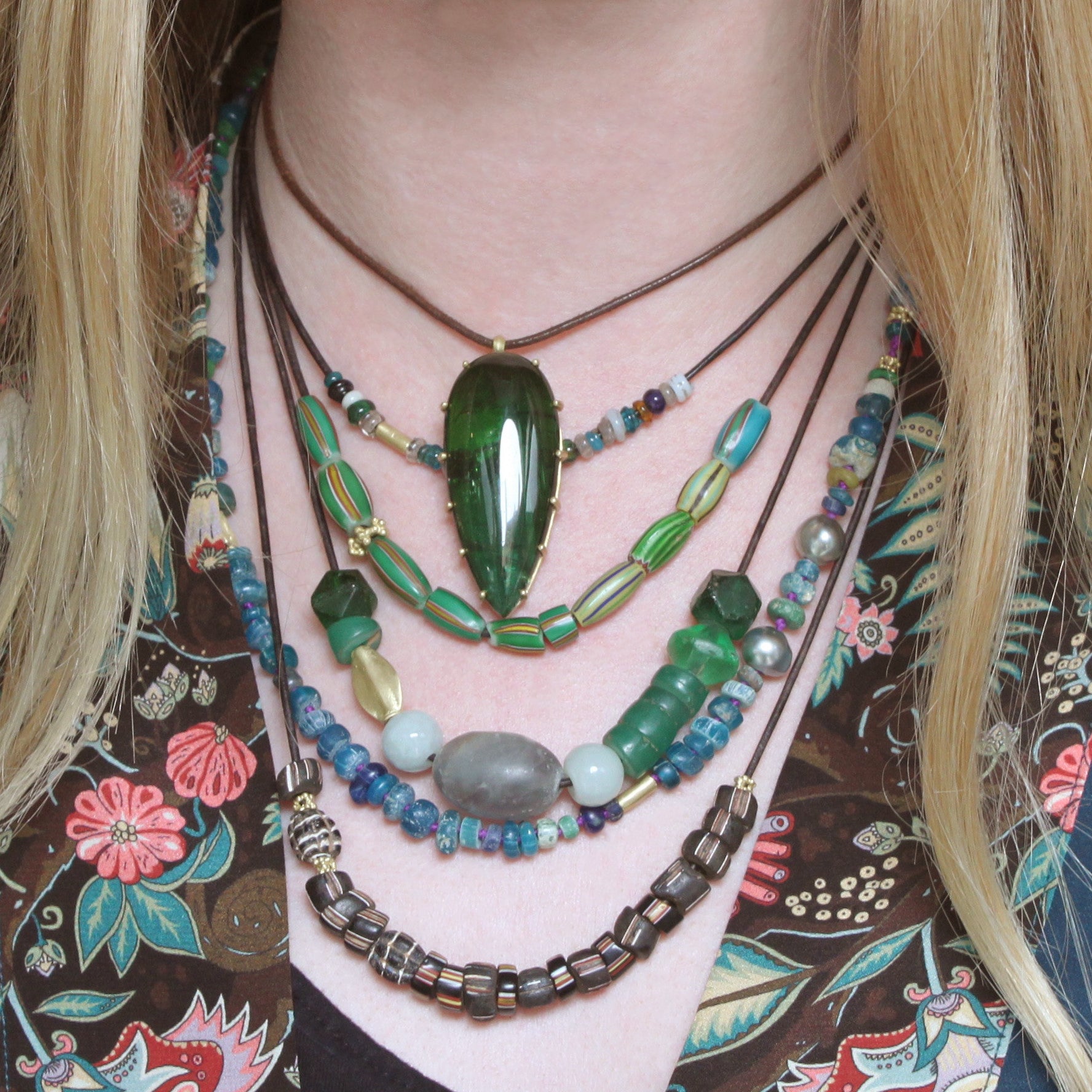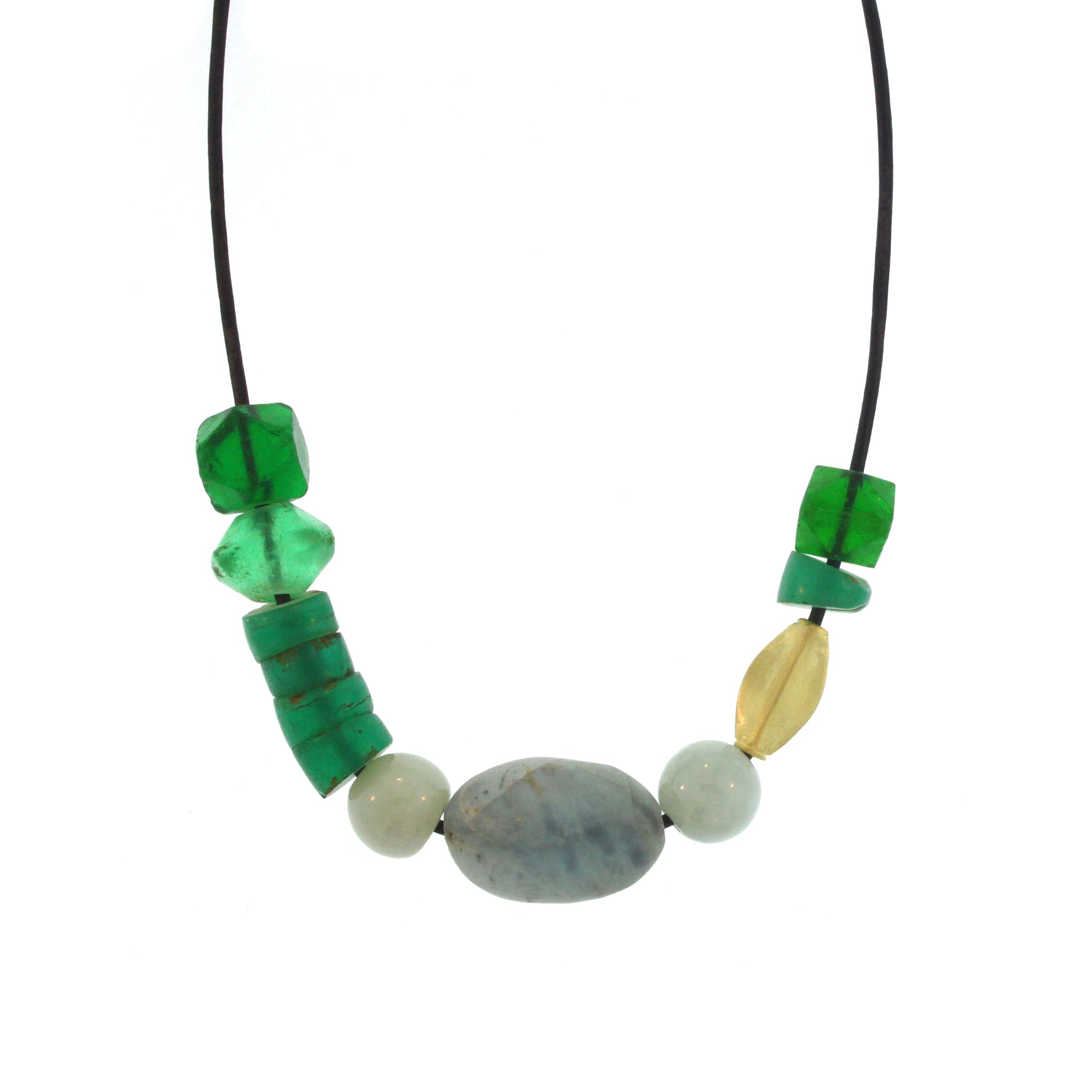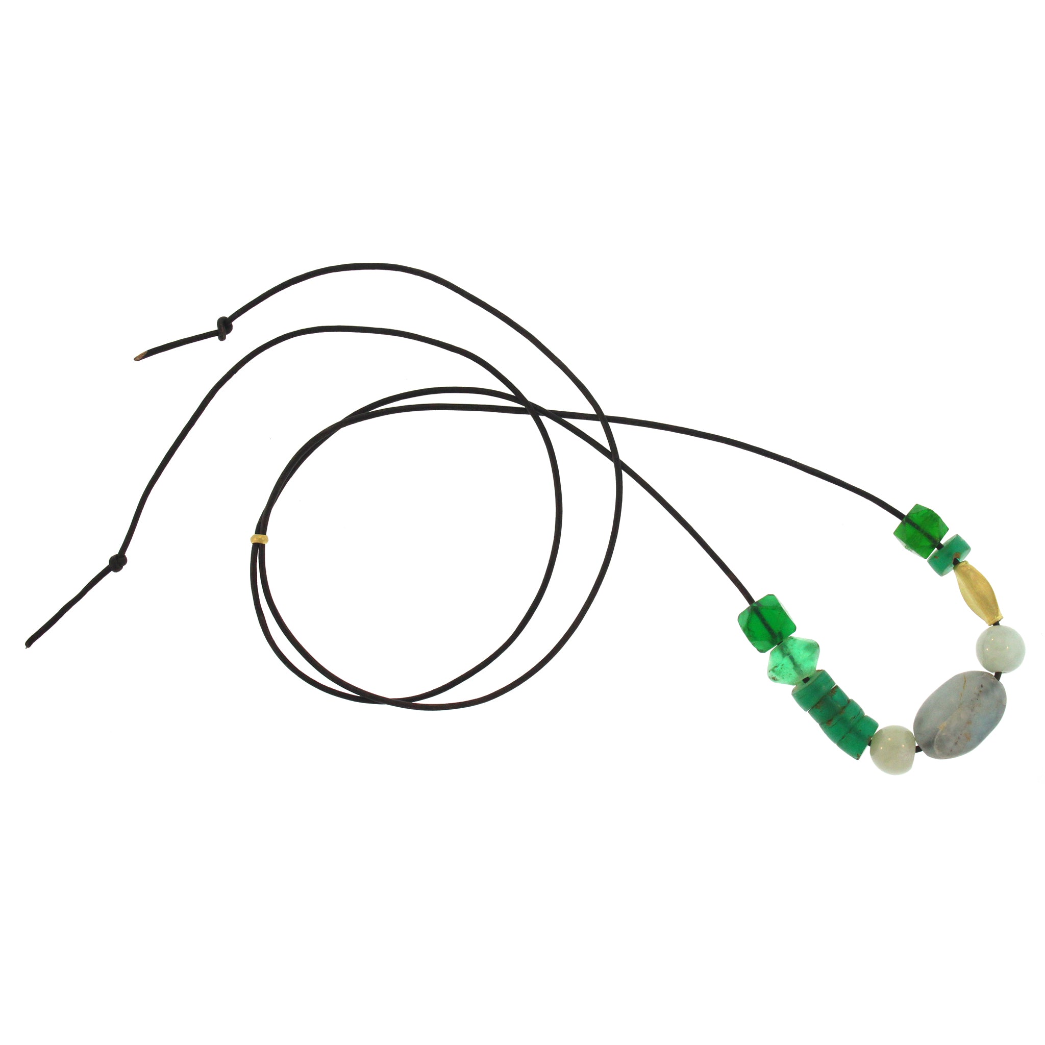 This one-of-a-kind necklace features ancient glass beads in varying shapes and hues of verdant green, accented by three beautiful light grey agate beads and an 18K yellow gold fish bead. The beads stretch approximately 4.25 inches along the leather cord when laid flat. The 32 inch length is fully adjustable, by moving the small 18K gold bead at the back of the neck to achieve the desired length. This unique necklace can be worn alone, or as a component of a more layered look. Please inquire about all available options.