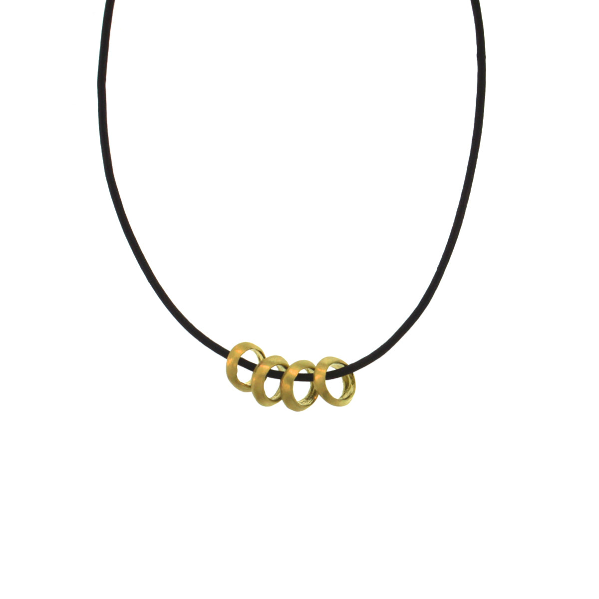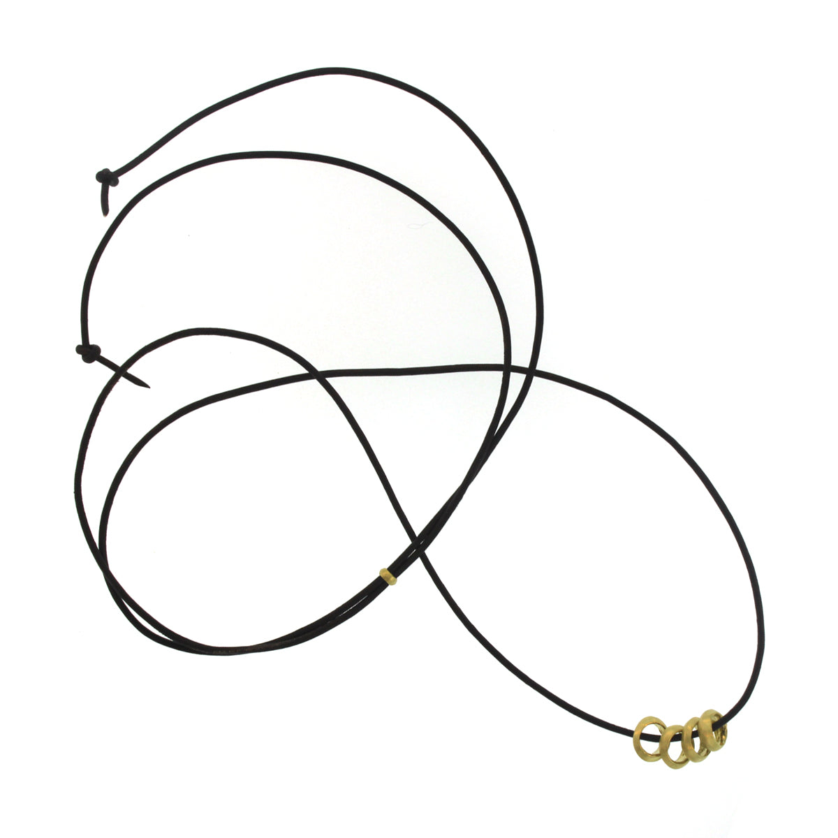Four 18K yellow gold rings create a bold focal point in this enchanting necklace. The knife edge gold loops hang from a 32 inch leather cord, which is fully adjustable by moving the 18K gold sizing bead at the back of the neck to achieve the desired length. The beads measure approximately 8.5mm in diameter and jingle beautifully with every move. This necklace may also be ordered in 18K white or rose gold, or with a different number of rings. Please inquire about all available options.